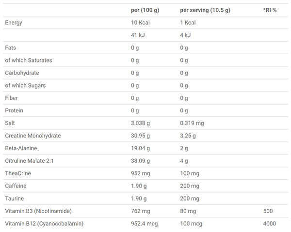 Mix 1 Serving 10.5 g (1 Level Scoop) with 250ml of cold water and consume 15 minutes prior to exercise. Contains 200 mg of Caffeine Per Serving.