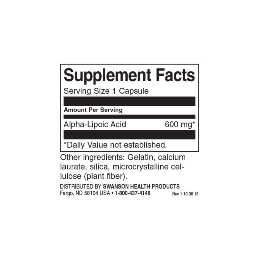 Alpha lipoic acid (ALA) is a naturally occurring compound that plays an important role in cellular energy production and antioxidant defence. Swanson Alpha Lipoic Acid delivers a high-strength 600 mg dose in a convenient capsule format.