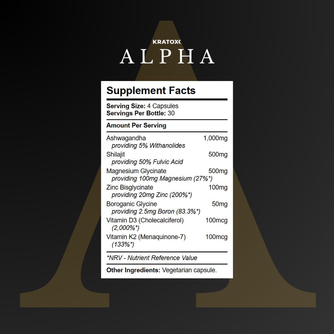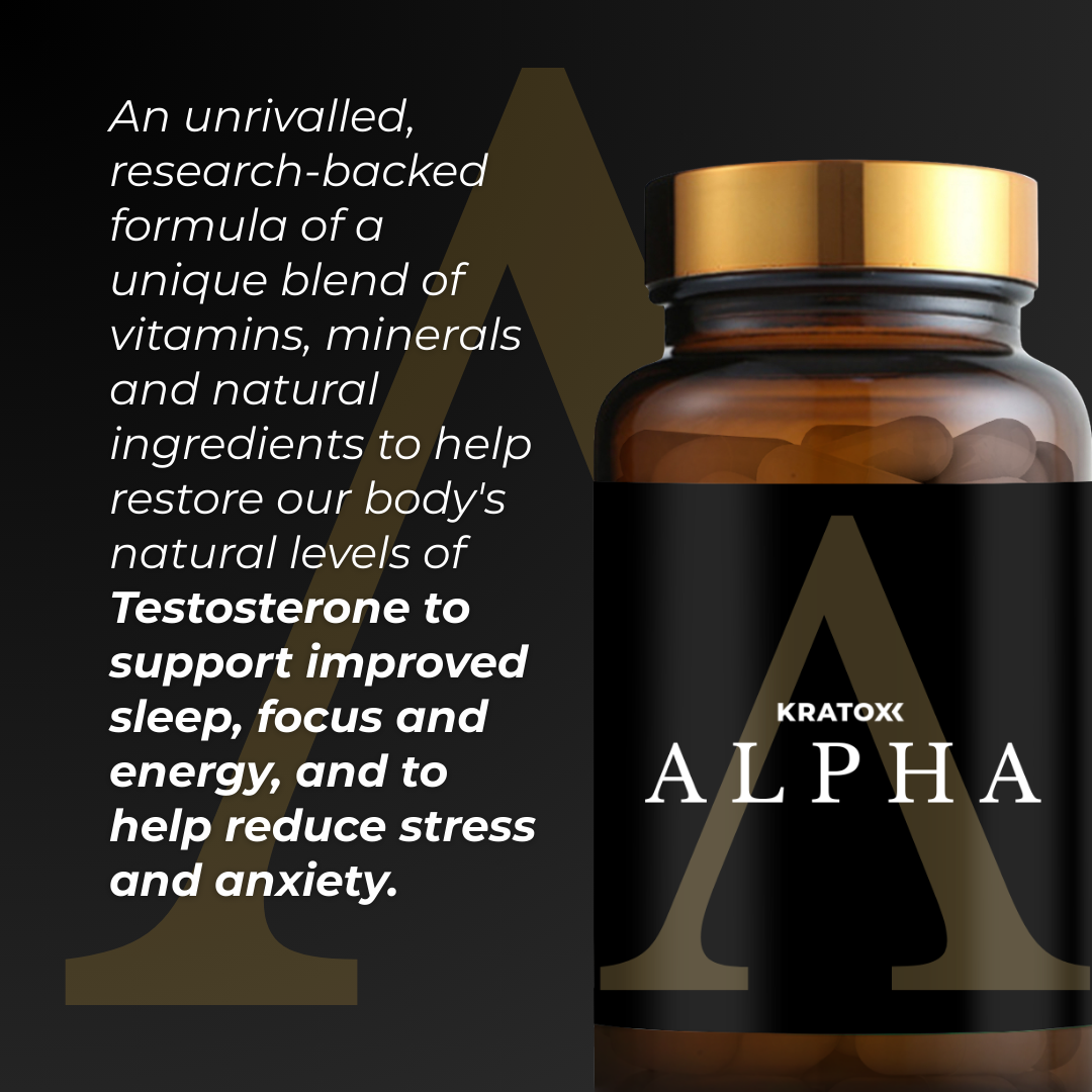 Using a precise, science-backed formula of natural ingredients along with vital vitamins and minerals, Kratox Alpha is designed to help restore and support our Testosterone levels to improve our energy, focus and sleep, and to help reduce anxiety and stress.