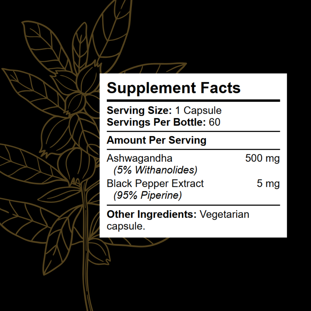 Supplement Facts panel for Ashwagandha 500mg supplement — ingredient list and extract dosage per serving.