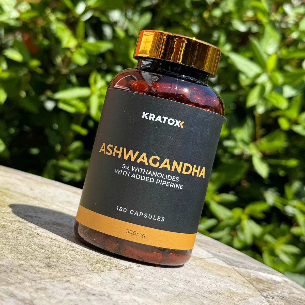 Bottle of Kratox Ashwagandha capsules with a gold and black label on a white background