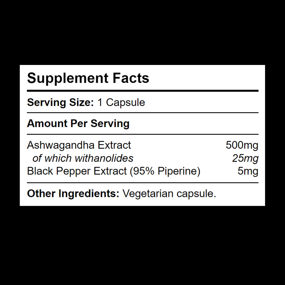 Ashwagandha root extract (500 mg, 5% withanolides) — A full-spectrum root extract providing withanolides, the key active compounds that help support stress regulation, emotional balance, and sleep quality. Traditionally used to promote resilience, calm, and a more stable mood.