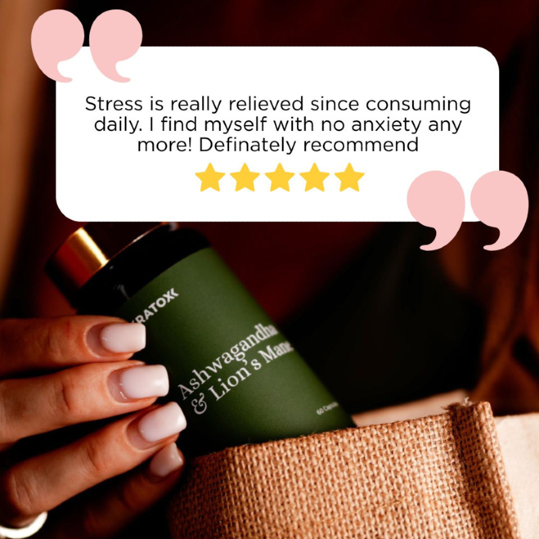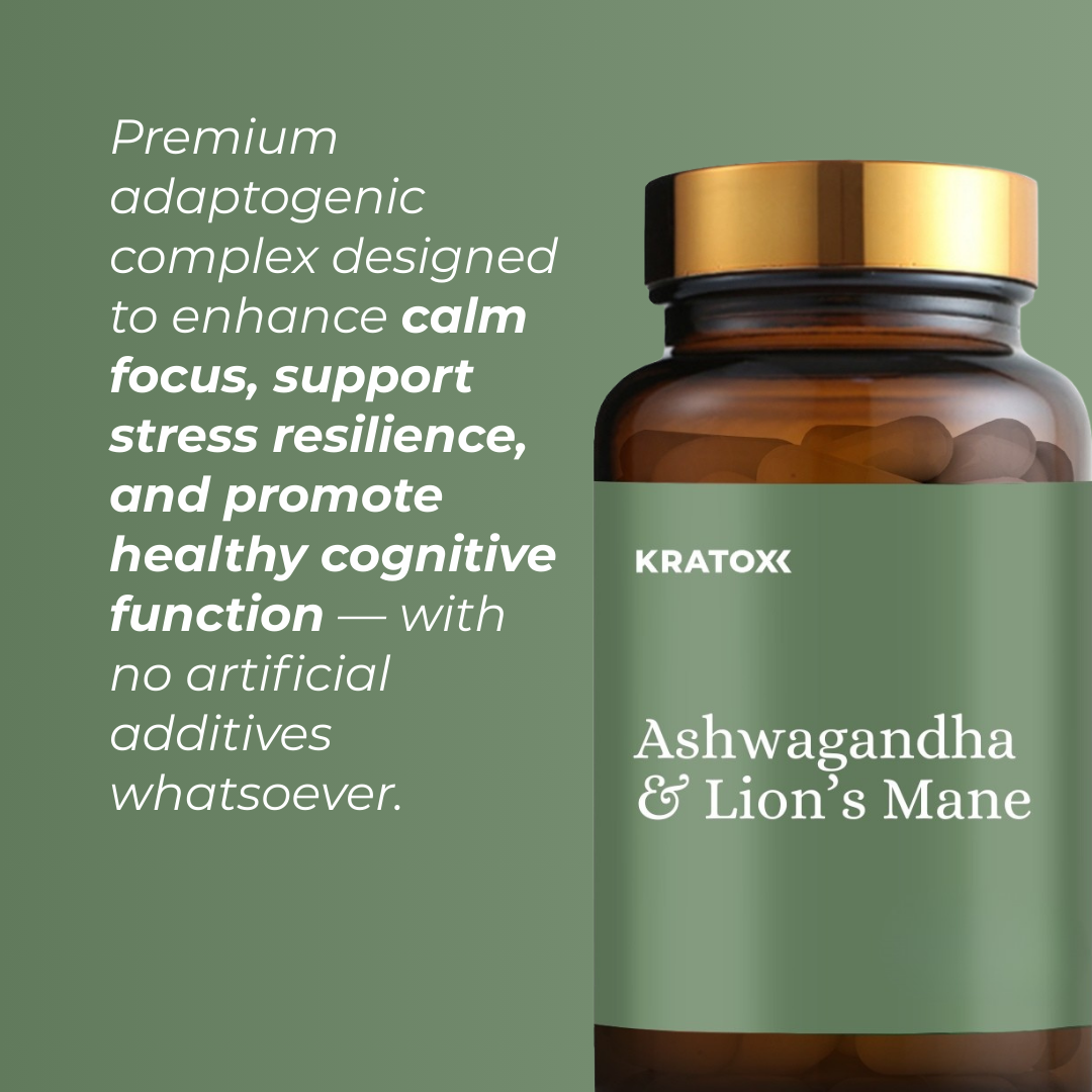 Kratox Lion's Mane & Ashwagandha brings together two of nature’s most respected adaptogens in one clean, synergistic formula. Lion’s Mane is widely known for its support of cognitive function, memory, and nerve regeneration. Ashwagandha is a cornerstone of traditional Ayurvedic practice, valued for its ability to reduce stress, support hormonal balance, and enhance resilience.