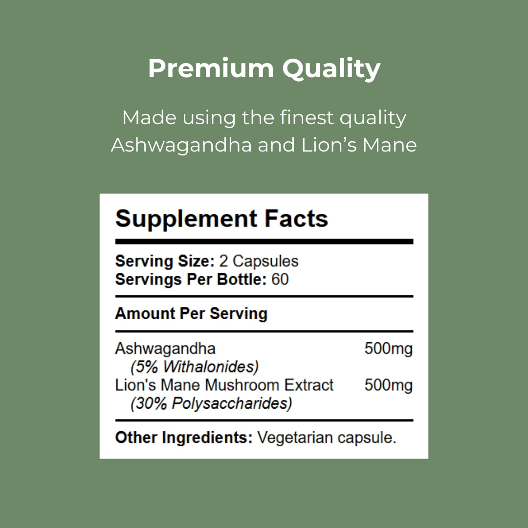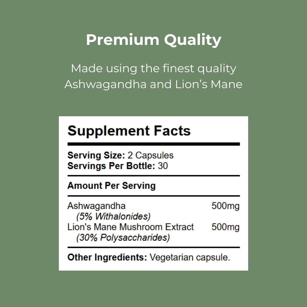 A powerful blend of the finest quality Lion’s Mane and Ashwagandha, this formula is designed to support cognitive clarity, stress resilience, and daily mental performance — naturally and without additives.