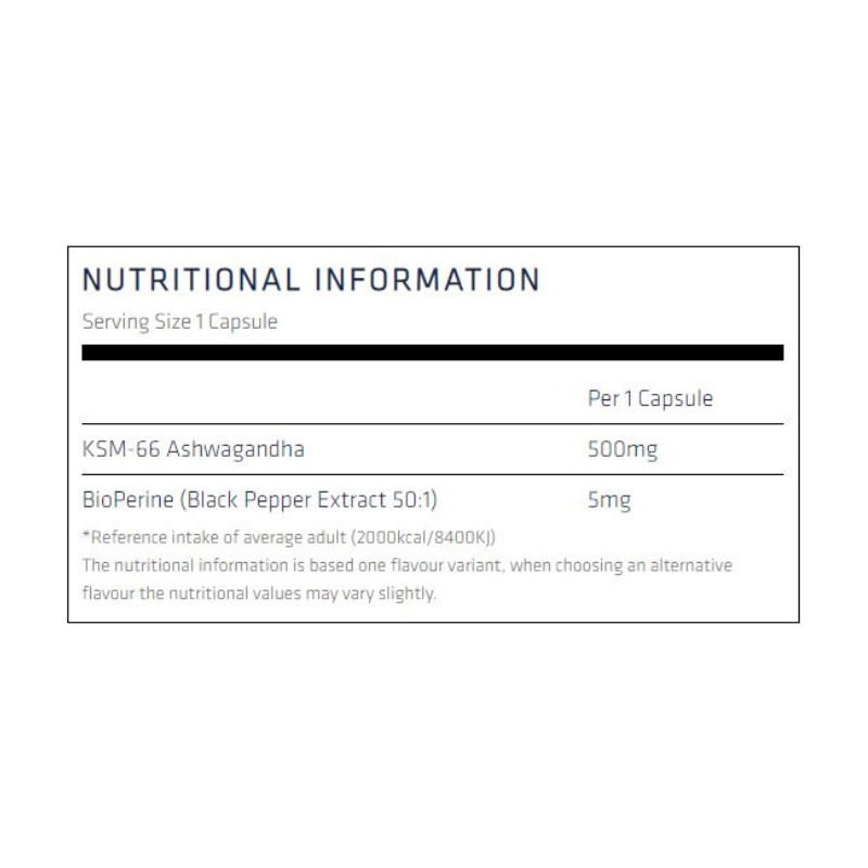 KSM-66 Ashwagandha® (Withania somnifera), Capsule [Hydroxypropyl methylcellulose, Colour (Titanium Dioxide)], BioPerine® (Black Pepper Extract Piper nigrum L. 50:1), Anti-caking agents (Silicon dioxide, Magnesium stearate).