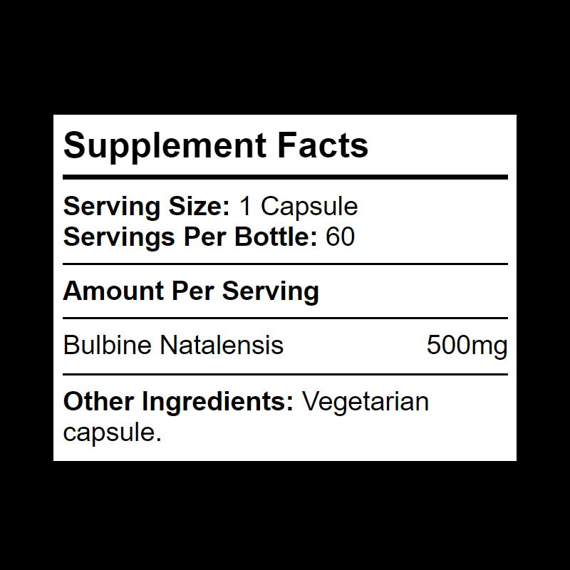 Each capsule contains 500 mg of Bulbine Natalensis extract. Sourced from South Africa, our formula is 100% clean-label—no fillers, binders, artificial colours or preservatives—ensuring purity and quality.