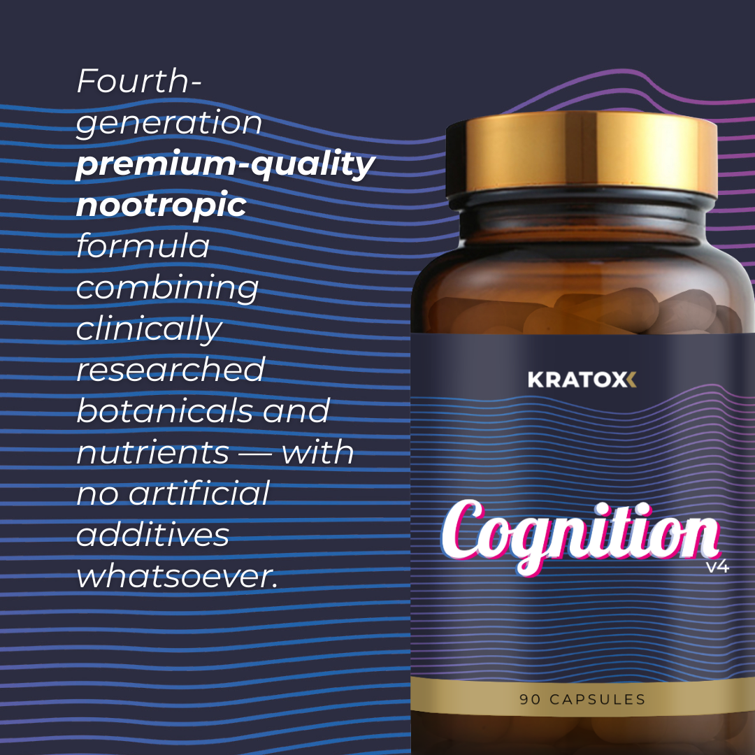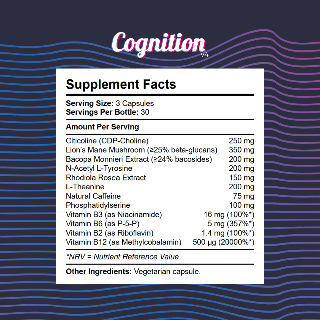 Cognition v4 is our latest fourth-generation nootropic supplement, introduced in January 2026. It’s formulated to support focus, mental clarity, and calm, sustained energy using a blend of clinically researched botanicals, amino acids, and nutrients.