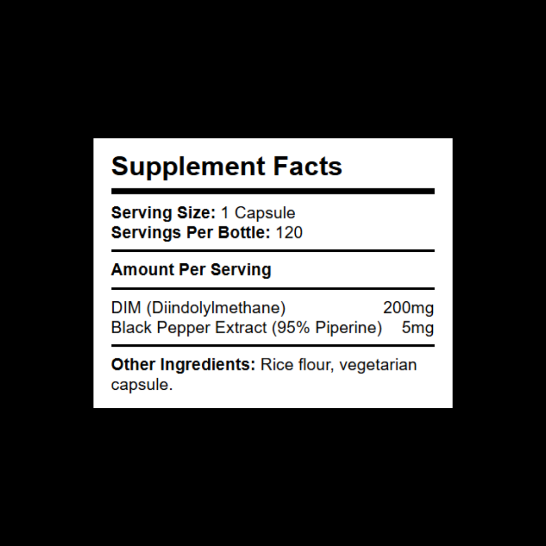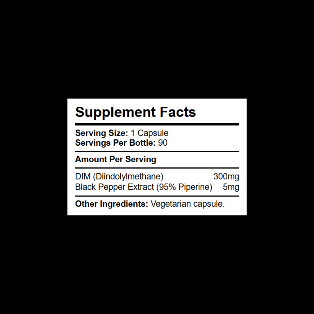 Each capsule delivers high-purity Diindolylmethane (DIM) at either 200 mg or 300 mg. We prioritise premium-grade active material and a clean, minimal formula—free from artificial colours, binders, preservatives, and unnecessary fillers.
