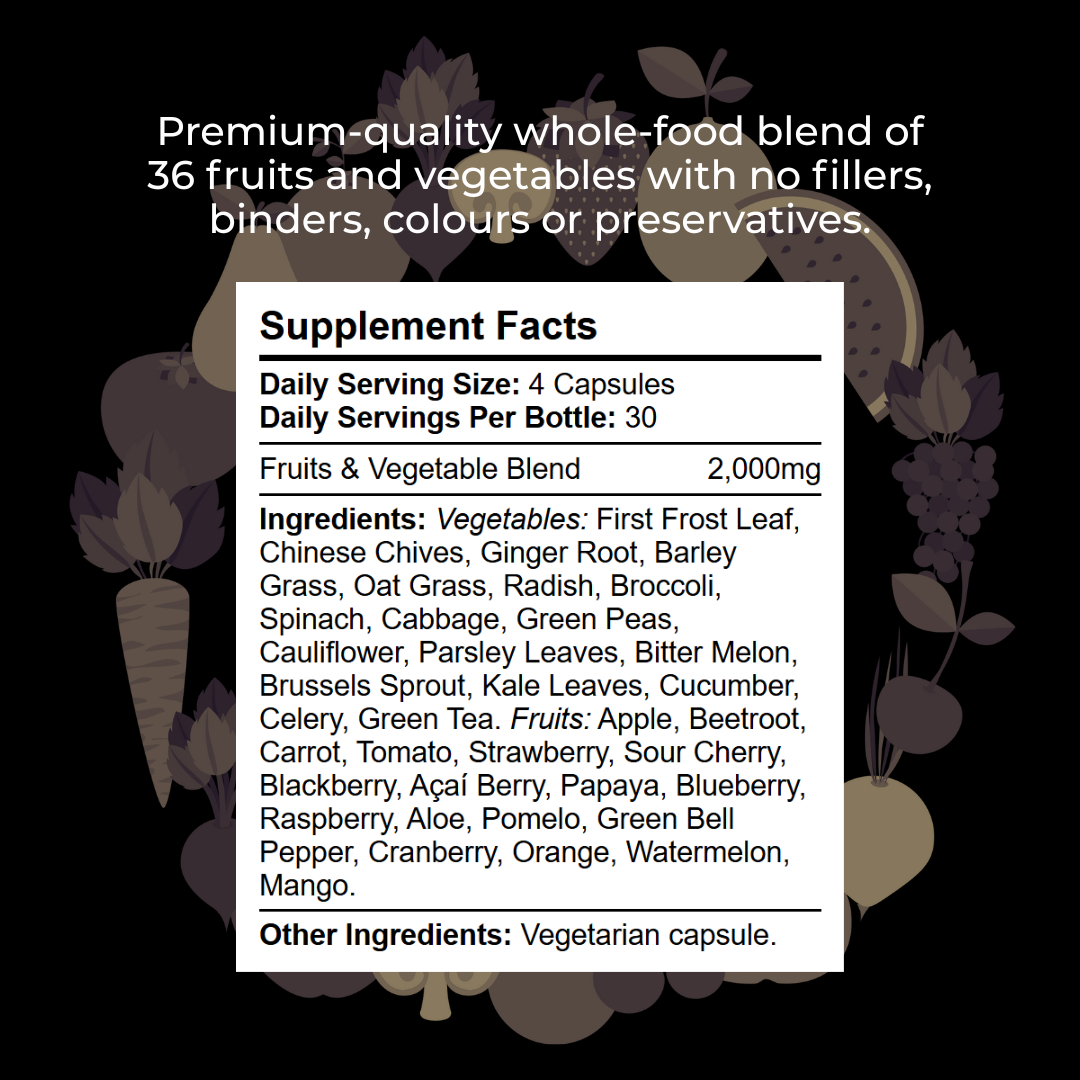 This formula is designed to help bridge the nutritional gap of a modern diet by delivering concentrated nutrients from 36 different fruits and vegetables. Each capsule offers a wide spectrum of vitamins, minerals, polyphenols and antioxidants naturally present in whole foods.
