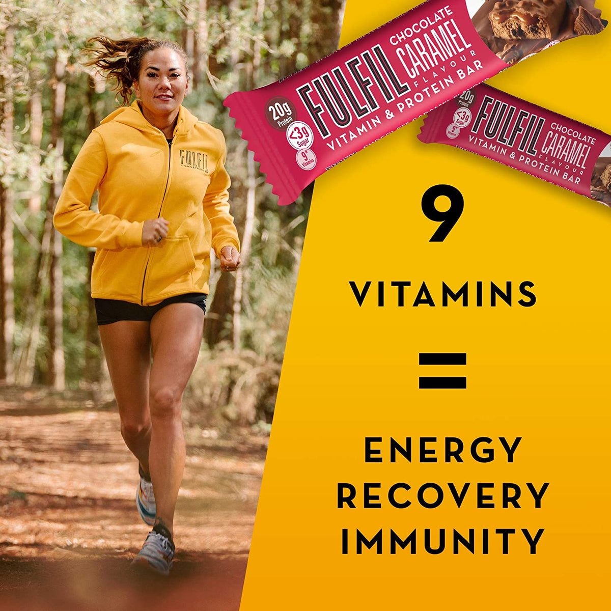 A chewy centre, a creamy caramel layer, and a crispy coating of delicious milk chocolate. This bar also has 192 calories, 20 grams of protein, 2 grams of sugar, 9 essential vitamins, and 2 grams of fat per serving.