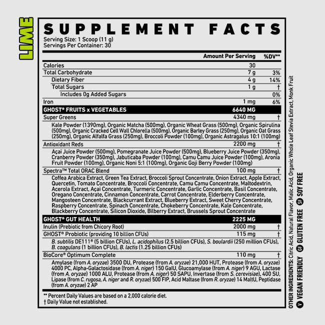 GHOST® GREENS combines 19 individually sourced Greens and Reds with a full 100mg dose of Spectra™, Prebiotics, 10 Billion CFU Probiotic and the super-premium BioCore® Optimum Complete Digestive Enzymes...plus, we've partnered with the legends at ONE TREE PLANTED to plant a tree for every unit sold. 1 Tub = 1 Tree!
