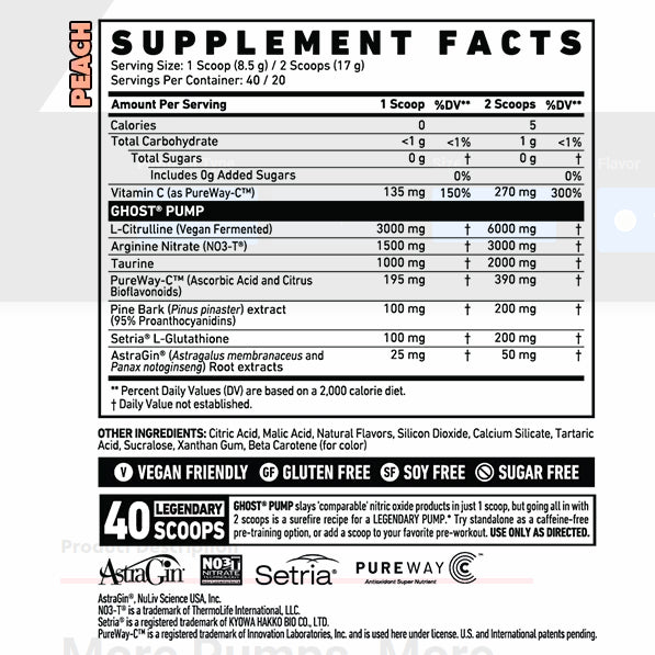 GHOST® PUMP raises the bar with even more of the pump ingredients we all love...L-Citrulline (Vegan Fermented), NO3-T® Arginine Nitrate (a patented pump ingredient that we really think is the best EVER) and some awesome new inclusions (Setria® and PureWay-C™), plus we're dropping this EPIC V2 in some of our favourite GHOST® flavours.