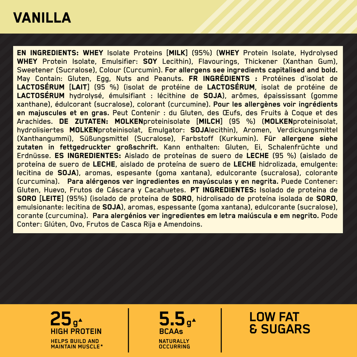 Optimum Nutrition Gold Standard 100% Isolate – the ultra-filtered whey protein isolate delivering 25g protein, 1g carbs, 1g fat per serving. Perfect for lean muscle, cutting, or post-workout recovery.