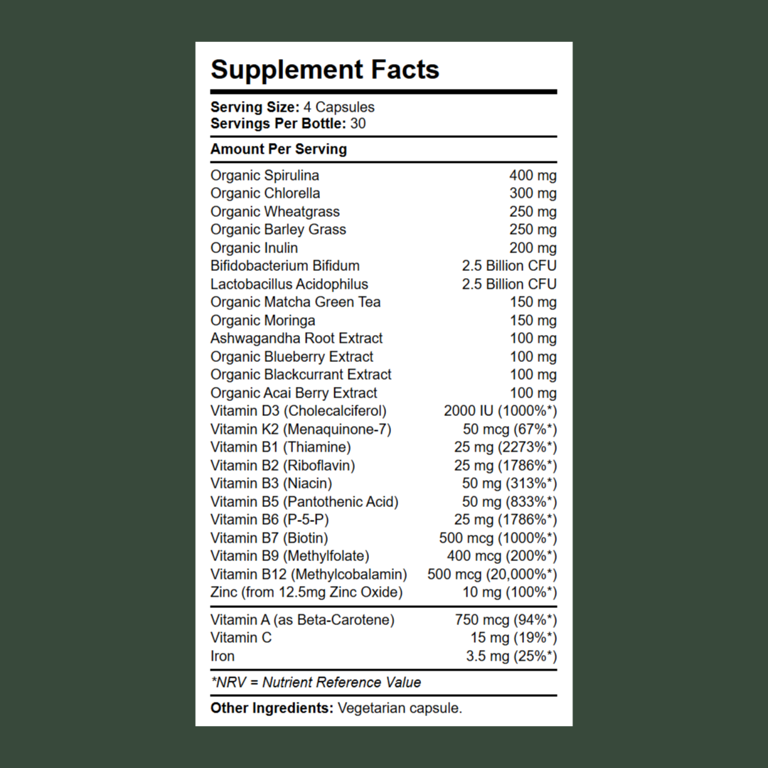 This supplement is made using high-grade, organic plant extracts, live probiotics, and active nutrients, all encapsulated in a clean, vegetarian capsule. There are absolutely no artificial colours, preservatives, or fillers, making it suitable for anyone seeking a clean, nutrient-dense greens formula.