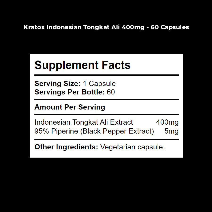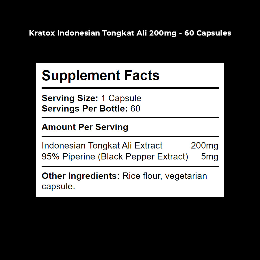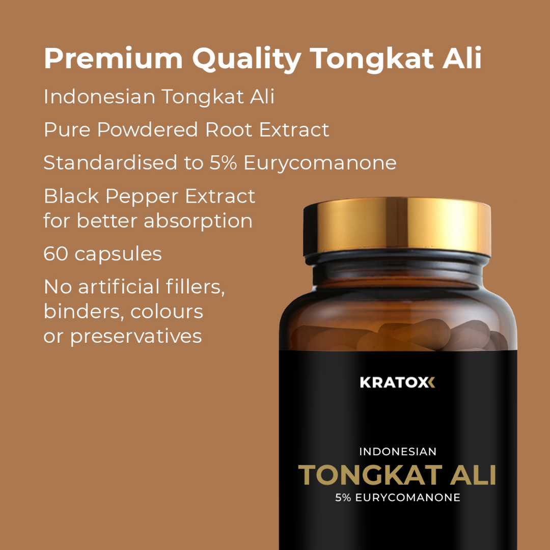 As with all Kratox supplements, our Indonesian Tongkat Ali is made using only the highest quality raw ingredient at a proven dosage and made with no artificial colours, binders, fillers or preservatives.