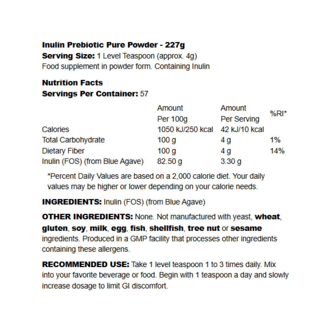 Each teaspoon (approx. 4g) provides pure organic inulin from blue agave or chicory root. The powder is certified organic, non-GMO, vegan, and contains no artificial colours, flavours, preservatives, or fillers. Manufactured to GMP standards by Now Foods for quality and purity you can trust.