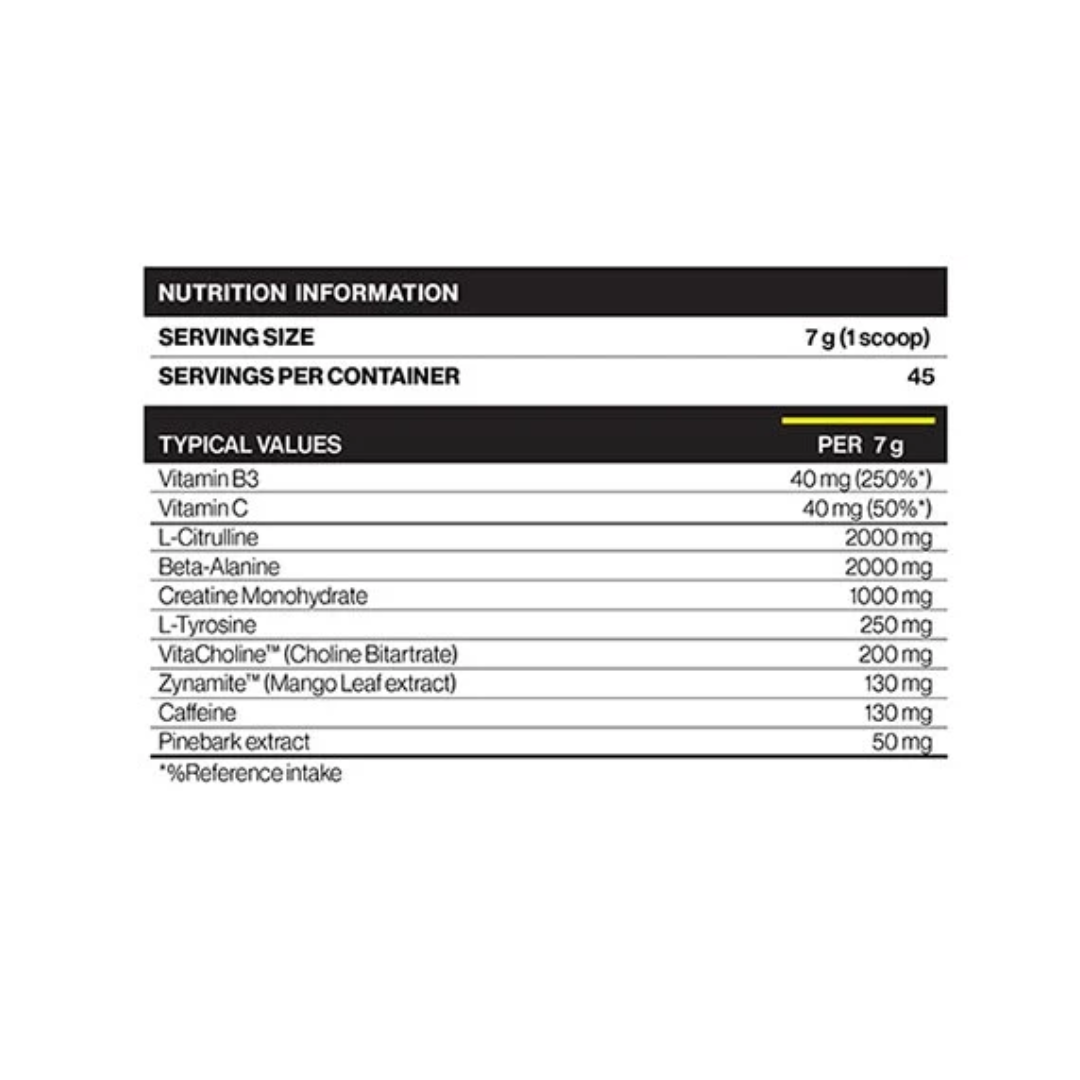 This formula is built around a focused selection of performance and stimulant ingredients used to support energy, endurance, and mental drive during training.