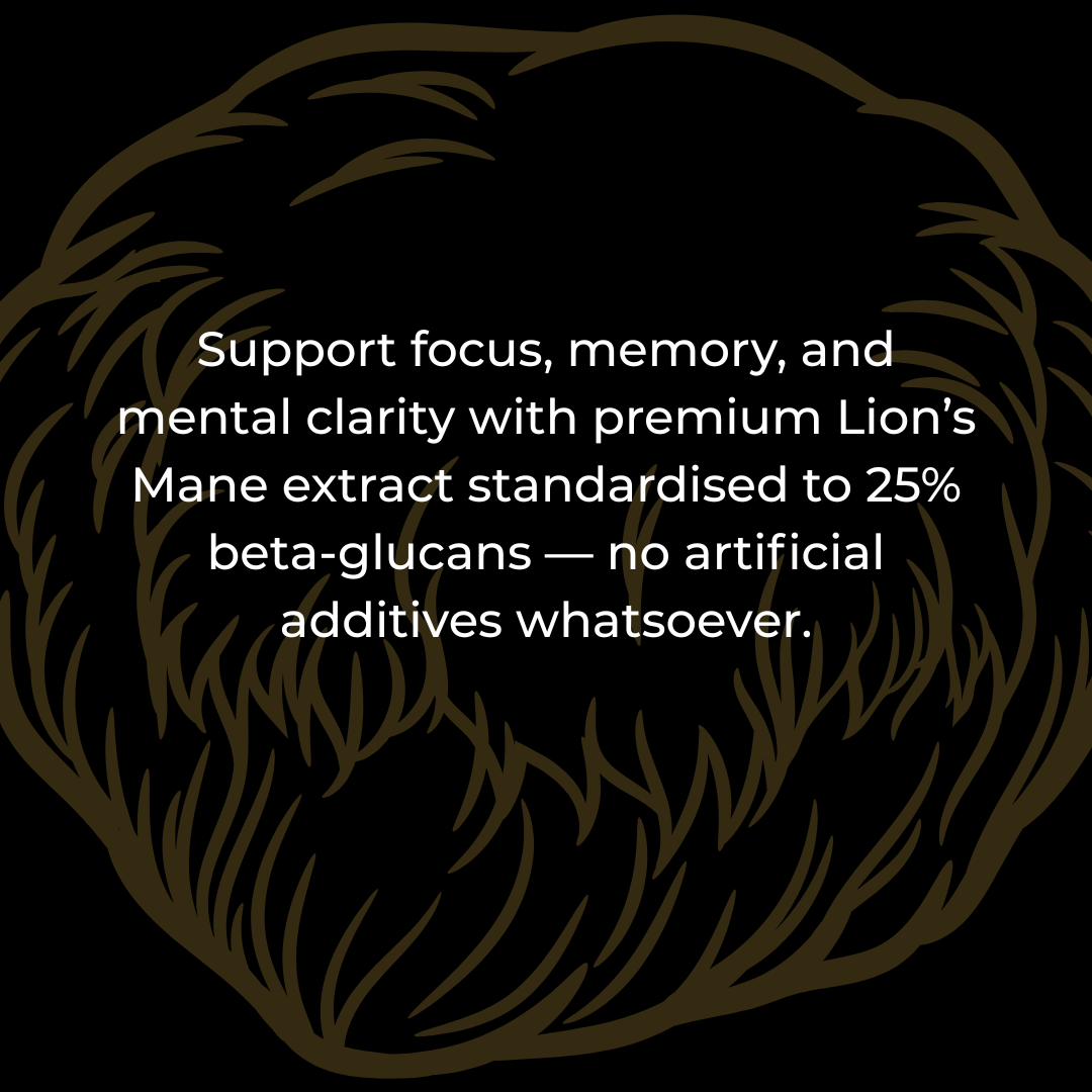 Each capsule contains 500mg dual-extracted Lion's Mane (Hericium erinaceus) fruiting body extract, standardised to 25% beta-glucans — the active compounds linked to enhanced cognitive function and Nerve Growth Factor (NGF) production. Only the finest quality mushroom extract is used, with no mycelium, grains or unnecessary additives.