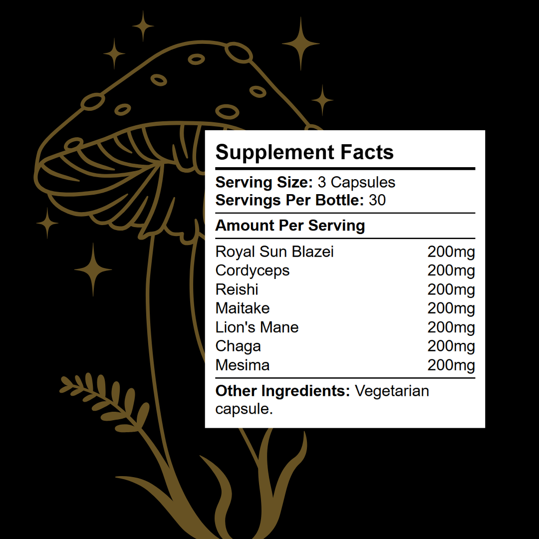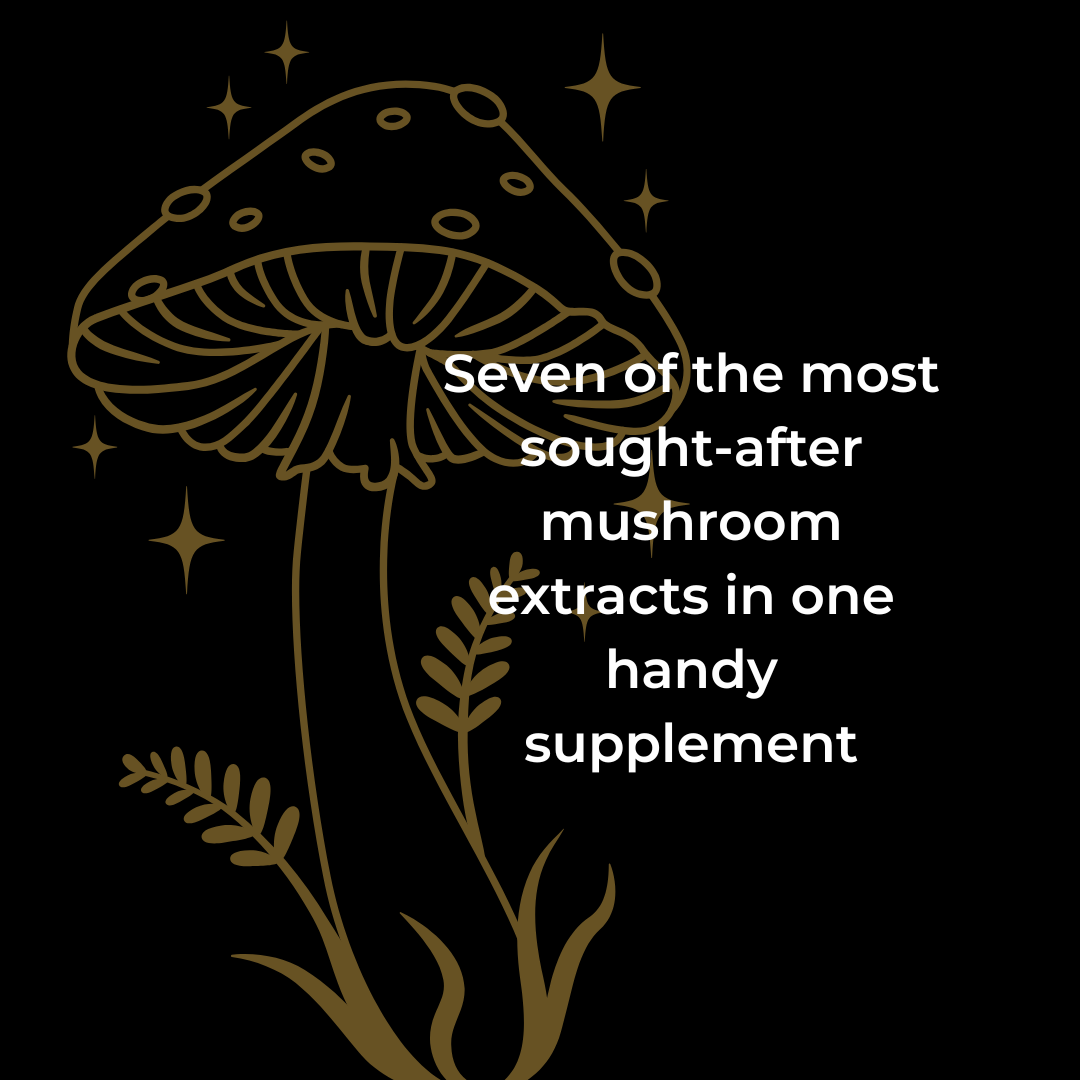Combining a blend of seven of the most sought-after mushroom extracts, including Lion's Mane, Cordyceps, Reishi, Maitake, Chaga, Mesima and Royal Sun Blazei, without any artificial binders, fillers, colours or preservatives.