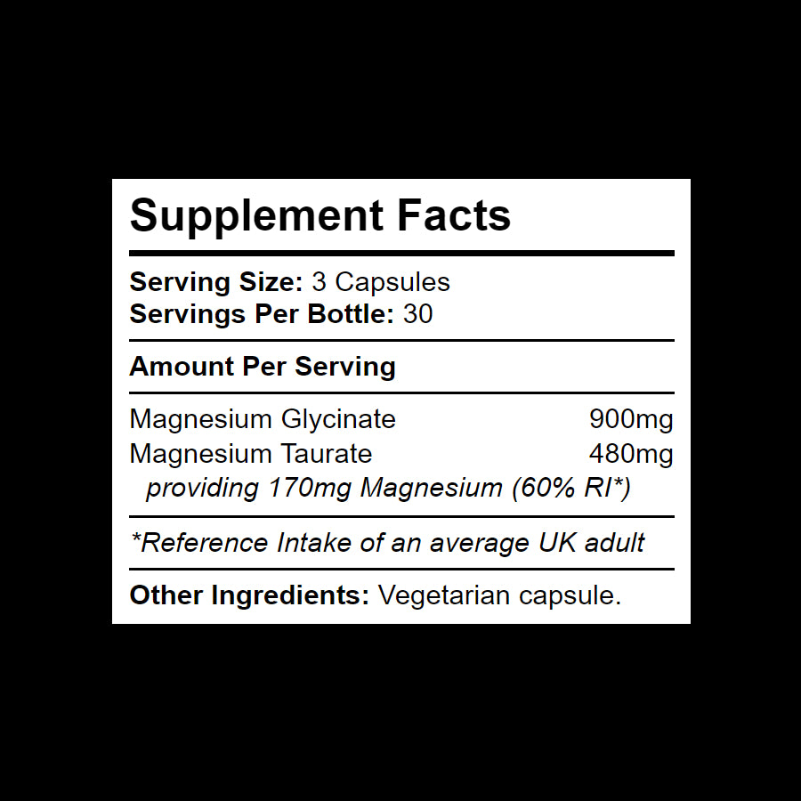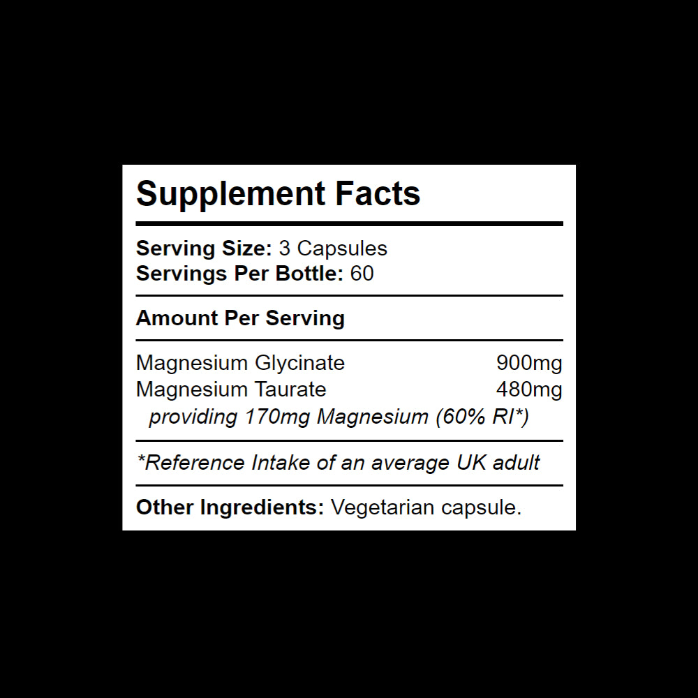 - Magnesium Taurate (480mg) – supports cardiovascular health and combines well with Glycinate for a complete effect.