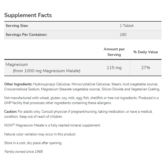 Magnesium is a mineral that is necessary for the metabolism and production of energy, muscle contraction, the transmission of nerve impulses, and the formation of bone.* It is a cofactor that about 300 enzymes need.* Fatty acid synthesis, protein synthesis, and glucose metabolism are among the reactions sparked by these enzymes.* Because it is an important intermediate in the Krebs cycle, malate plays an important role in the production of carbohydrates-derived cellular energy.*