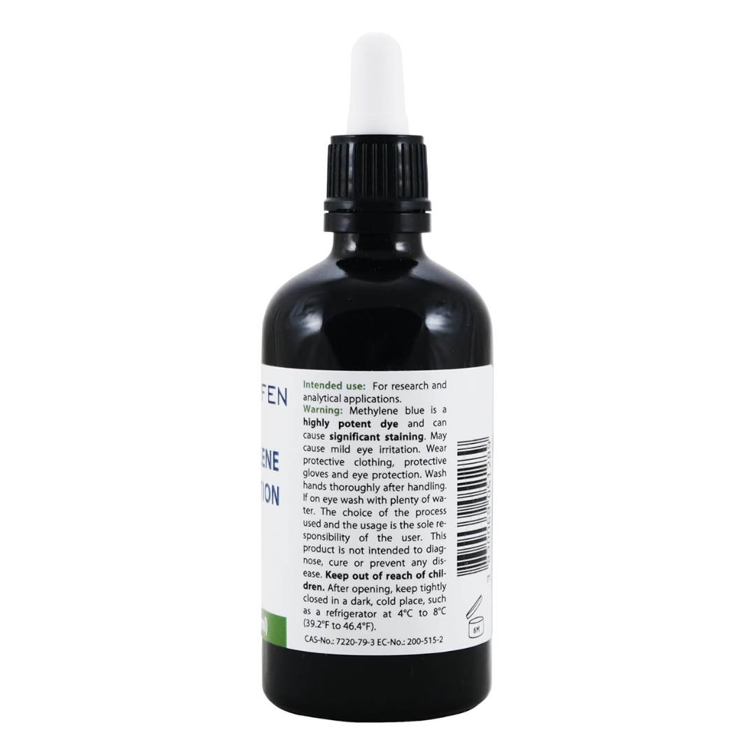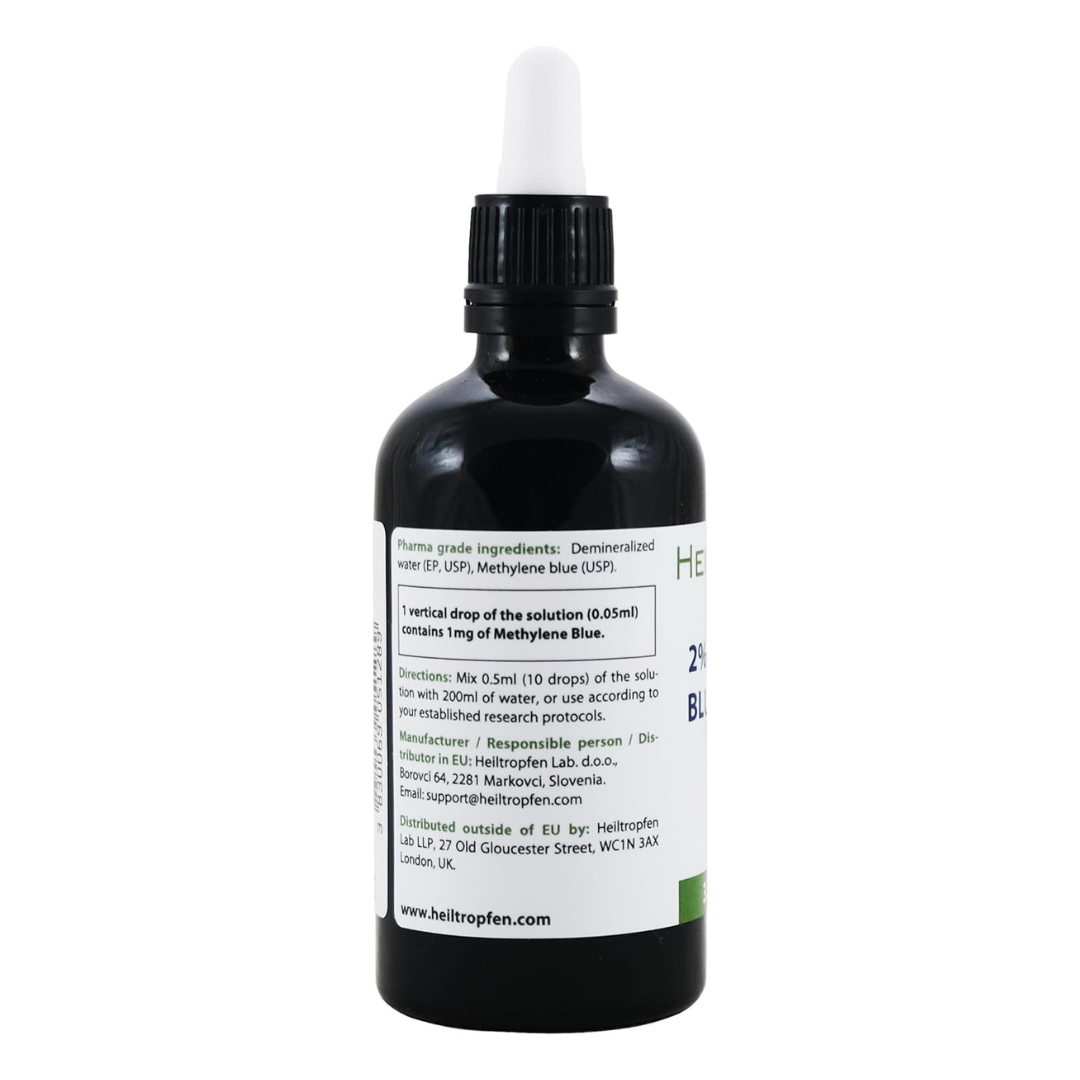 High-purity 2% Methylene Blue solution formulated with pharmaceutical-grade ingredients, designed for precision research use and long-term stability.