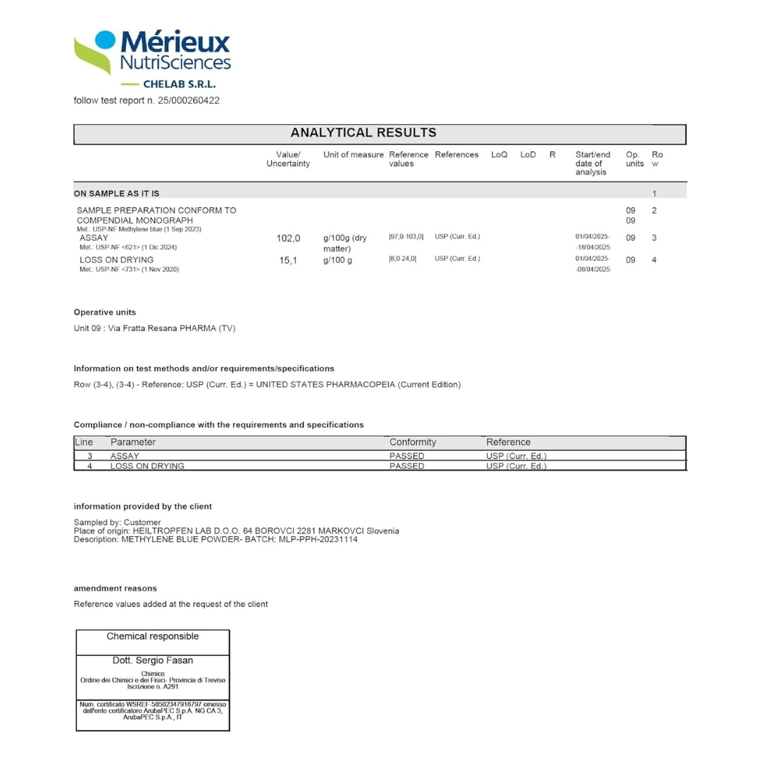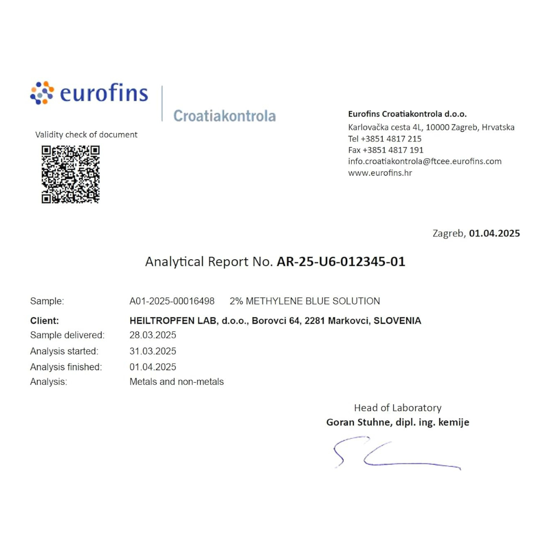 Demineralised water (EP, USP) and Methylene Blue trihydrate (USP) – both pharma-grade and carefully sourced to ensure consistency and purity. The solution is manufactured in a facility certified for GMP, ISO 22000, and ISO 22716 standards, guaranteeing strict quality control at every stage.