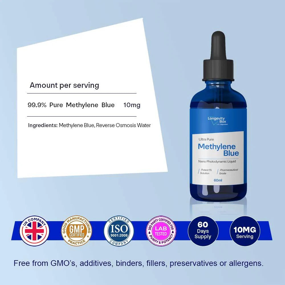 A high-purity solution providing 10mg of Methylene Blue per 1ml serving, formulated to 99% purity with no additives whatsoever.