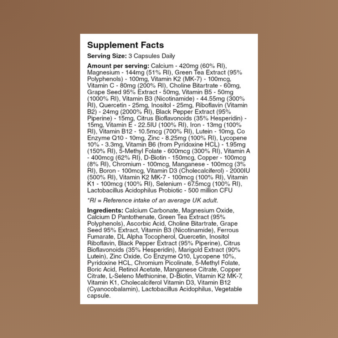 Premium-quality Advanced Multivitamin with a broad range of Vitamins, Minerals, Probiotics & Antioxidants. Free from artificial colours, binders, fillers or preservatives.