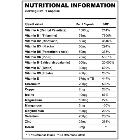 Formulated by Dean St Mart using Vitamin A as Retinyl Palmitate, eight B vitamins (B1 Thiamine, B2 Riboflavin, B3 Niacin, B5 Pantothenic acid, B6 Pyridoxine-5-Phosphate, B7 Biotin, B9 Methylfolate, B12 Methylcobalamin), Vitamin E as alpha-tocopherol; and the minerals Chromium, Copper, Iodine, Magnesium, Manganese, Molybdenum, Selenium, Zinc and Boron.