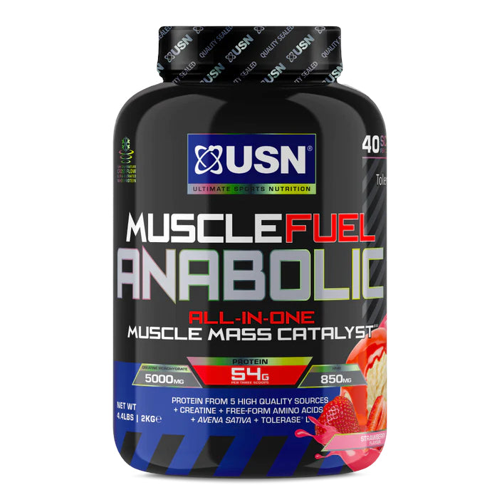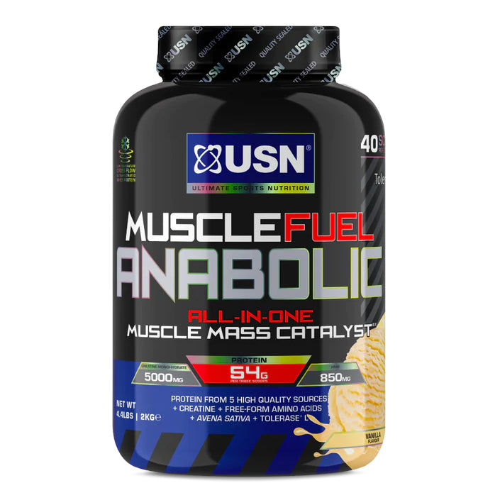 A high-calorie all-in-one gainer shake delivering 54g protein, 548 kcal, 78g carbs per serving with anabolic support. USN Muscle Fuel Anabolic maximises muscle growth and performance during intense training.