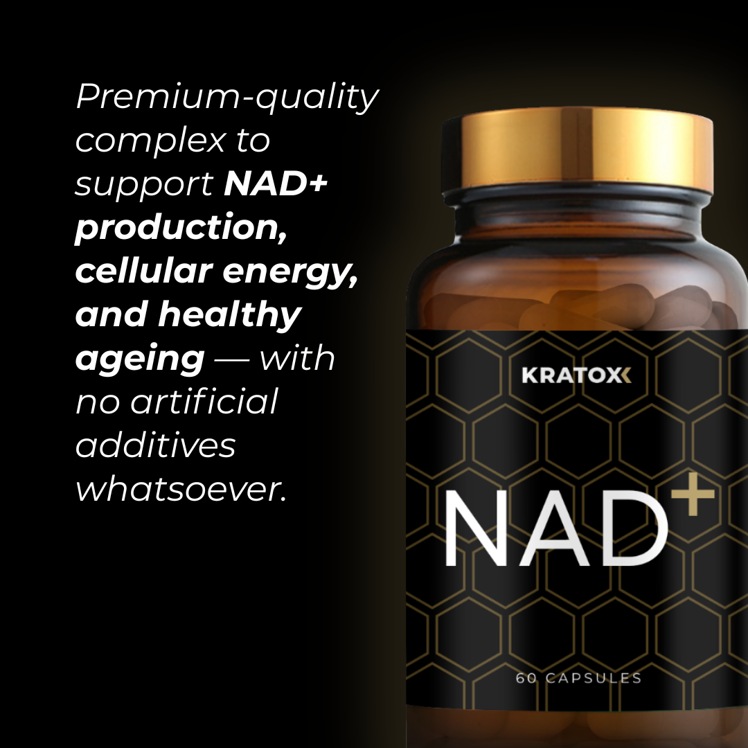 Kratox NAD+ is a cutting-edge supplement designed to support healthy ageing, cellular energy, and optimal NAD+ function. Formulated with a potent blend of NMN, Nicotinamide Riboside, and antioxidants, it helps power your longevity from the inside out.