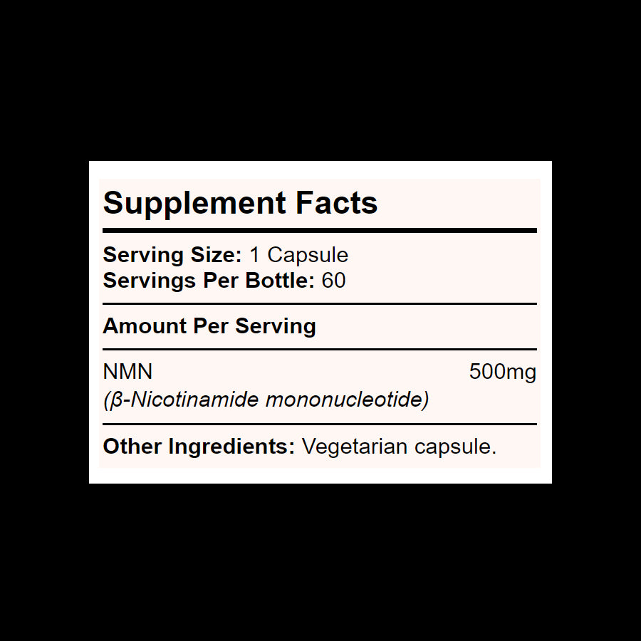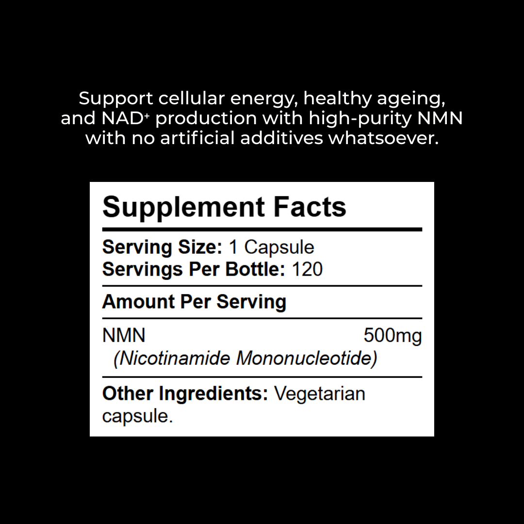 - 500mg NMN (β-Nicotinamide Mononucleotide) per capsule