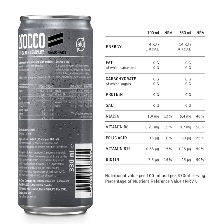 NOCCO Focus Ramonade has refreshing notes of rambutan, apple and melon that gets better with every taste. It's sugar-free and contains 180mg of caffeine & vitamins.
