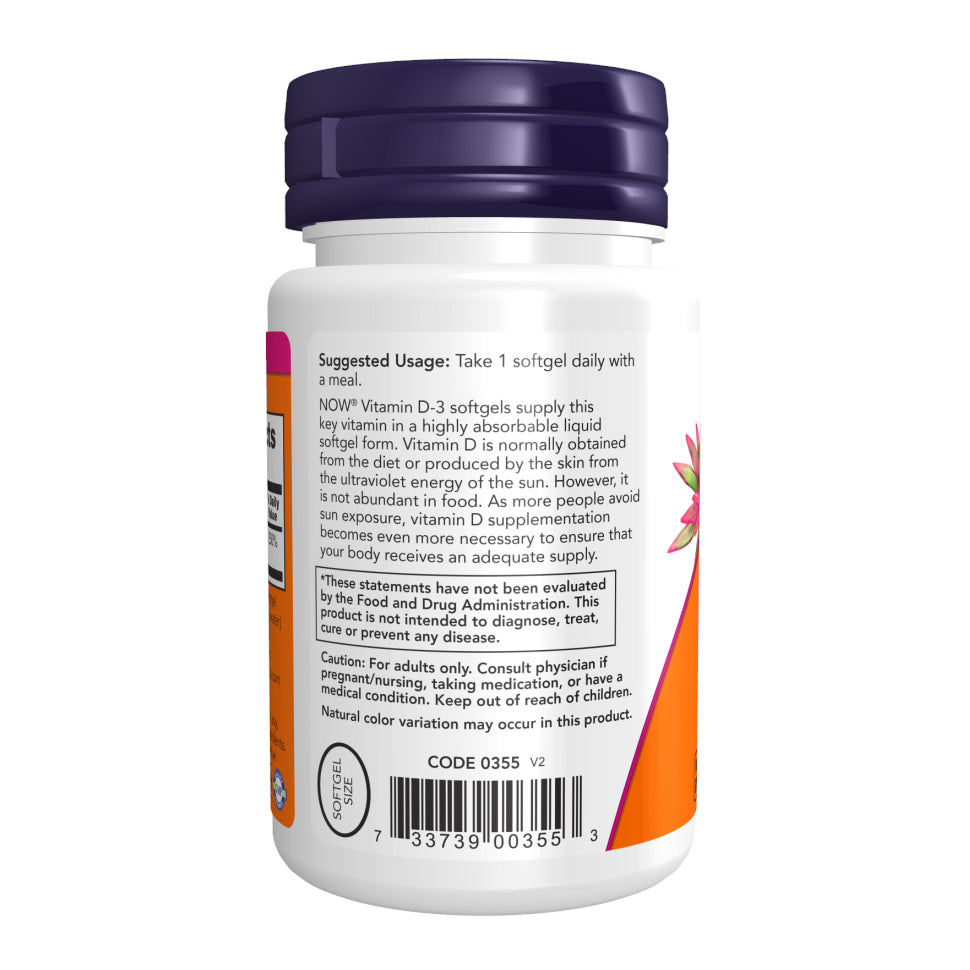 NOW® Vitamin D-3 softgels supply this key vitamin in a highly absorbable liquid softgel form. Vitamin D is normally obtained from the diet or produced by the skin from the ultraviolet energy of the sun. However, it is not abundant in food. As more people avoid sun exposure, vitamin D supplementation becomes even more necessary to ensure that your body receives an adequate supply.