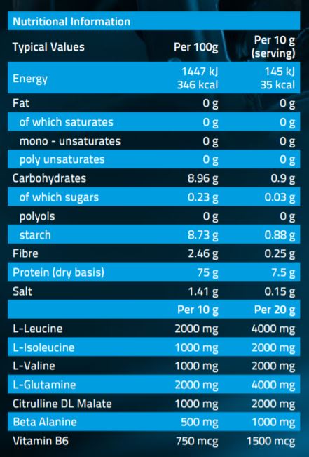 BCAA 2-1-1 Blend (L-Leucine, L-Isoleucine, L-Valine), L-Glutamine, Citrulline DL Malate, Flavouring (Cola), Beta Alanine, Coconut Water Powder, Acidifiers (Citric Acid, Malic Acid), Chicory (Vegetable) Fibre, Tri Calcium Phosphate, Tri Magnesium Citrate, Sodium Chloride, Sweeteners (Sucralose, Steviol Glycosides), Colouring (Caramel),