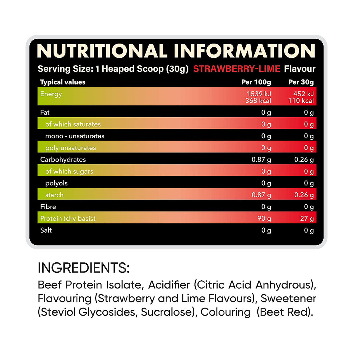 Beef Protein Isolate, Acidifier (Citric Acid Anhydrous), Flavouring (Blue Raspberry), Sweetener (Steviol Glycosides, Sucralose), Colouring (Brilliant Blue).