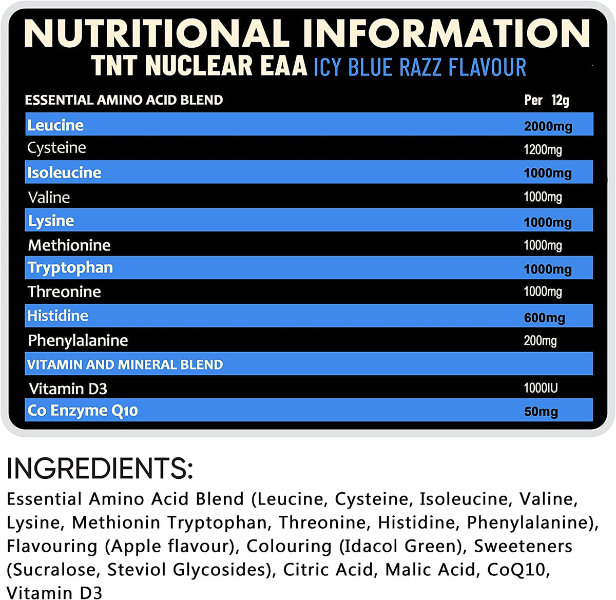 An explosive blend of EAA's in high quantities, combined with a unique vitamin & mineral blend for maximum uptake, Nuclear EAA achieves all the aforementioned targets that every athlete needs to be concerned with. Now with an added 1000IU of D3 and 50mg of CoQ10!