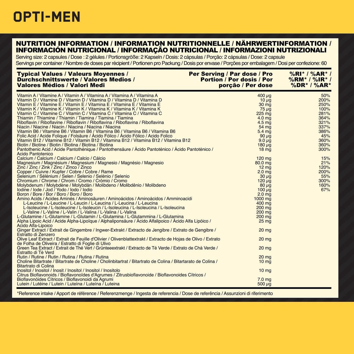 Bulking Agent (Microcrystalline Cellulose), Branched Chain Amino Acid Blend (L-Leucine, L-Isoleucine, L-Valine), Calcium Carbonate, L-Ascorbic Acid, L-Glutamine, Magnesium Oxide, Anti-Caking Agents (Silicon Dioxide, Magnesium Salts of Fatty Acids, Fatty Acids), DL-Alpha-Tocopheryl Acetate, Coating (Glazing Agent; HydroxypropylMethyl Cellulose; Thickener; Glycerol), Nicotinamide, Stabiliser (Cross-Linked SodiumCarboxy Methyl Cellulose), Alpha Lipoic Acid, Rutin, Calcium D-Pantothenate, Ginger Extract(Zingiber Officinale, Root), Olive Leaf Extract (Olea Europaea, Leaf), Green Tea Extract (Camellia Sinensis, leaf), Citrus Bioflavonoids, Sodium Borate, Zinc Oxide, Inositol, Choline Bitartrate, Pyridoxine Hydrochloride, L-Selenomethionine, Thiamin Hydrochloride, Cupric Sulphate, Cholecalciferol, Riboflavin, Retinyl Acetate, Chromium (lll) Chloride, Lutein Phylloquinone, Cyanocobalamin, Chromium Picolinate, Sodium Molybdate, D-Biotin, Potassium Iodide, Pteroylmonoglutamic Acid.