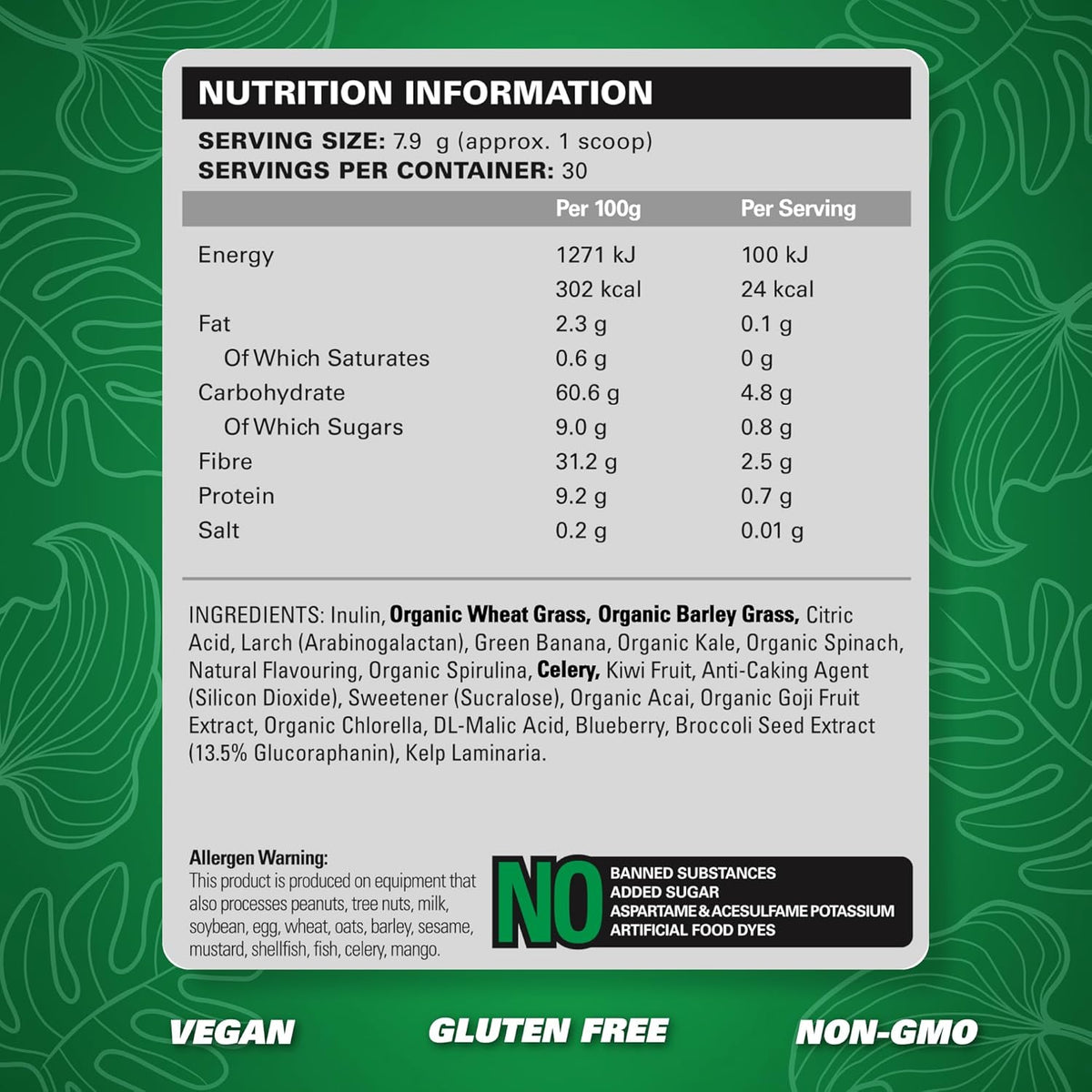 Full ingredient list (pineapple flavour): Inulin, Organic Barley Grass, Organic Wheat Grass, Natural Flavours, Citric Acid, Larch (Arabinogalactan), Green Banana, Organic Kale, Organic Spinach, Organic Spirulina, Celery, Kiwi Fruit, Sweetener (Sucralose), Vegetable Gum (Acacia), Silicon Dioxide, Organic Acai, Organic Goji Fruit Extract, Potassium Chloride, Organic Chlorella, Blueberry, Calcium Silicate, Broccoli Seed Extract (13.5% Glucoraphanin), Kelp Laminaria.