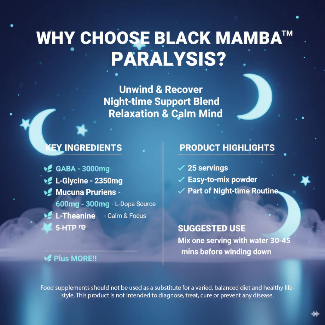 Black Mamba Paralysis is a premium sleep supplement designed to help you achieve unparalleled relaxation, deep sleep, and refreshed mornings.