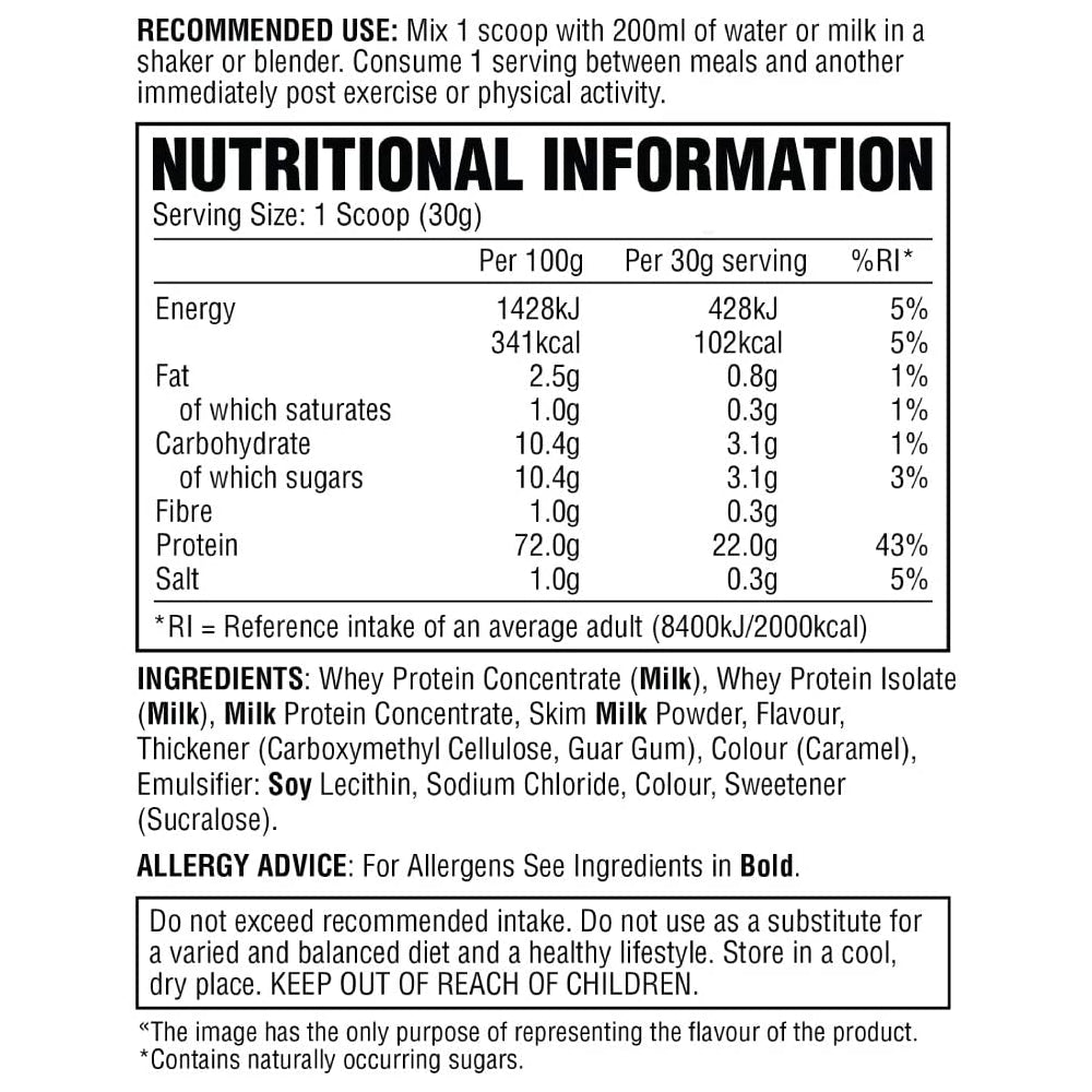 Mix 1 scoop with 200ml of water or milk in a shaker or blender. Consume 1 serving between meals and another immediately post exercise or physical activity.