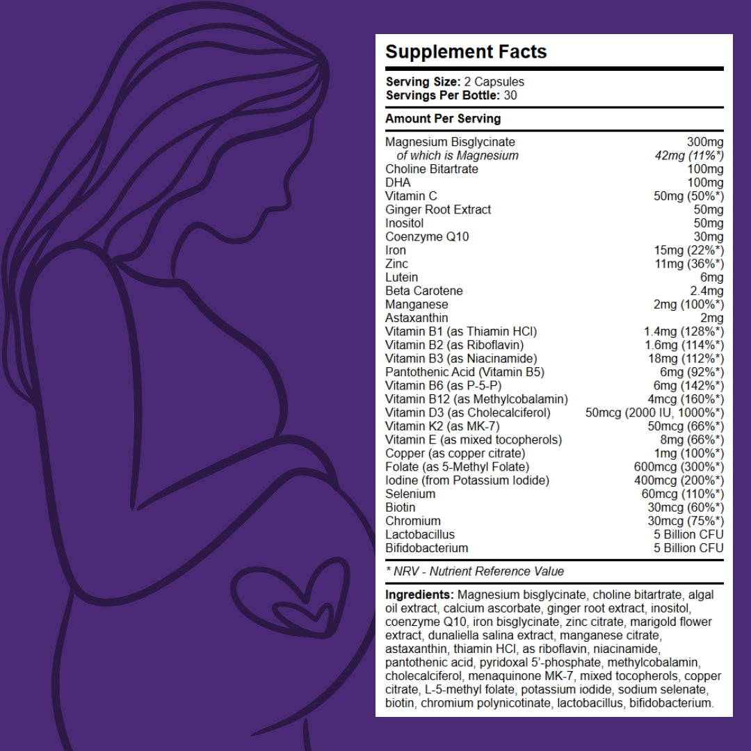 The inclusion of zinc, vitamin C, beta-carotene, lutein, and coenzyme Q10 offers antioxidant protection, supporting the mother’s immune system and cellular health during pregnancy. Magnesium bisglycinate promotes relaxation, supports muscle function, and may help reduce pregnancy-related cramps, while ginger root extract is known for its soothing effect on digestion and morning sickness relief. A full spectrum of active B vitamins (B1, B2, B3, B5, B6) also contributes to energy metabolism and reduces fatigue.