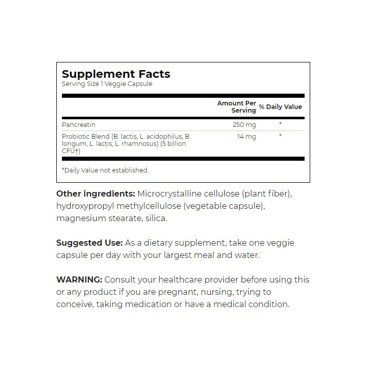 Swanson Probiotic+ Enzymes for Digestion delivers 5 billion CFU from 5 carefully selected strains backed by science, including Bifidobacterium lactis, Lactobacillus acidophilus, Bifidobacterium longum, Lactococcus lactis and Lactobacillus rhamnosus. This formula features pancreatin, which is made up of an amylase, a protease and a lipase. Together, these enzymes help digest carbohydrates, proteins and fats. Each serving delivers 250 mg of pancreatin. This formula is your healthy digestion powerhouse!