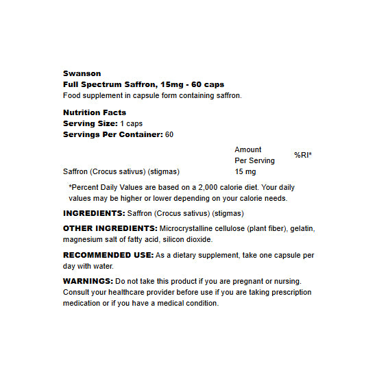 Swanson Full Spectrum Saffron is a high-quality supplement crafted to enhance your overall well-being. Featuring pure saffron extract, this formula supports mood balance, cognitive health, and stress management. Known for its antioxidant properties, saffron may also promote eye health and a positive outlook.