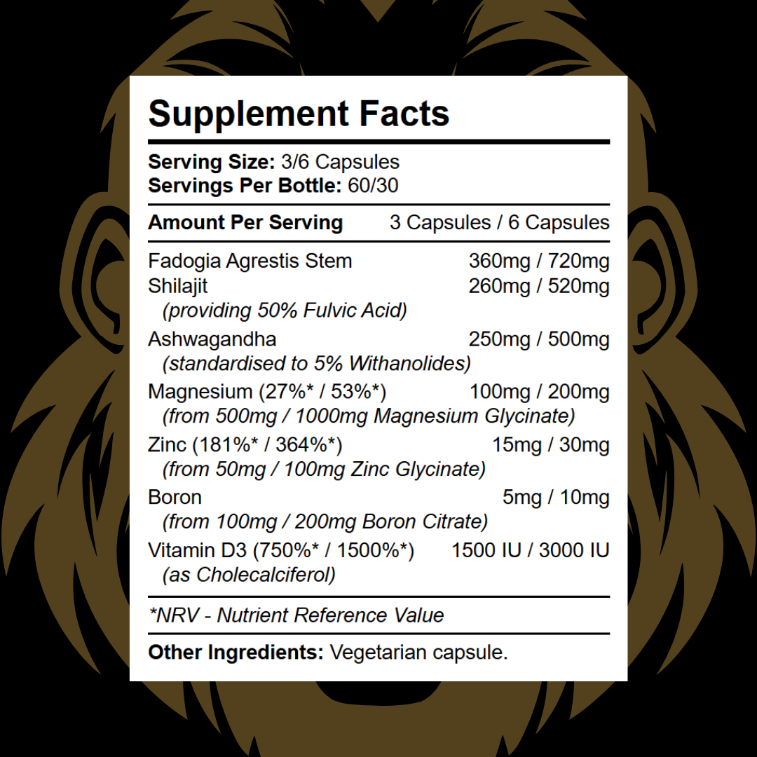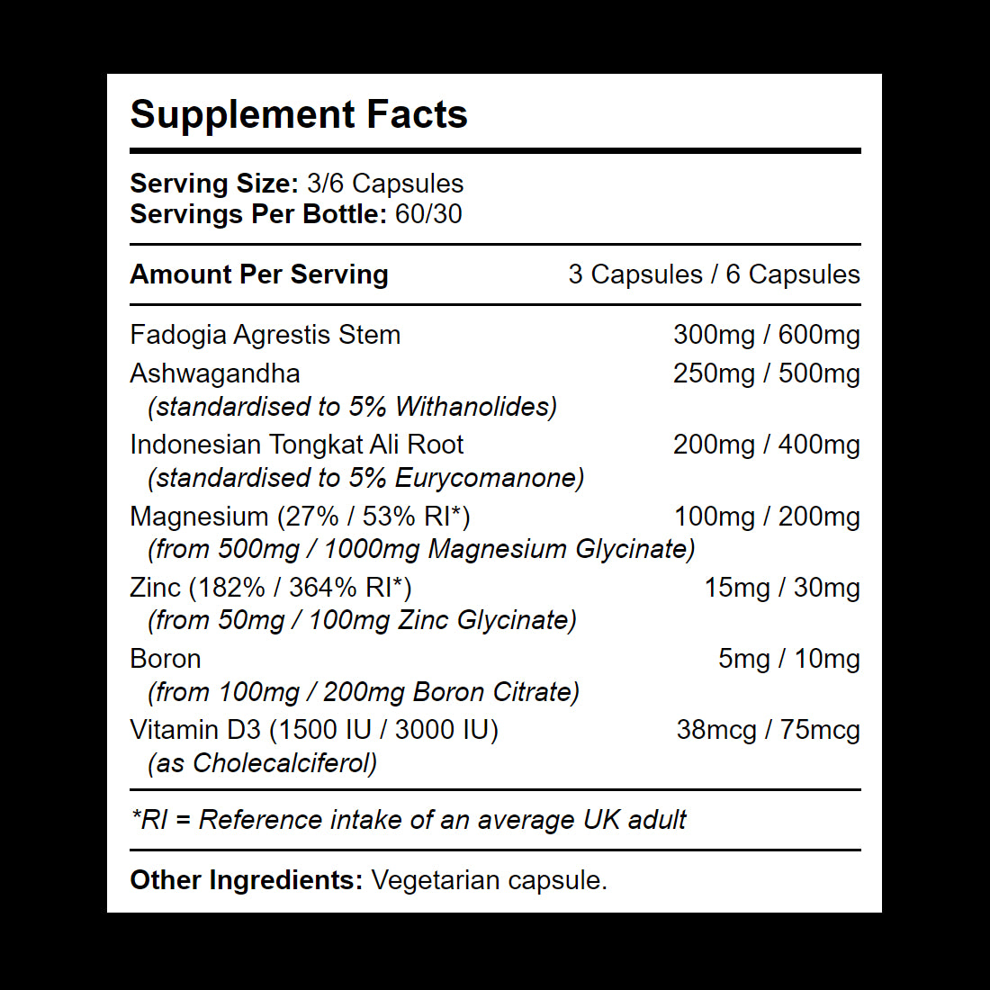 In addition to premium quality Indonesian Tongkat Ali Root, Fadogia Agrestis Stem and Ashwagandha, we've added other well-researched nutrients to help boost your testosterone levels: Magnesium Glycinate (a more bioavailable form of magnesium than is found in most supplements), Zinc, Vitamin D3 and Boron.