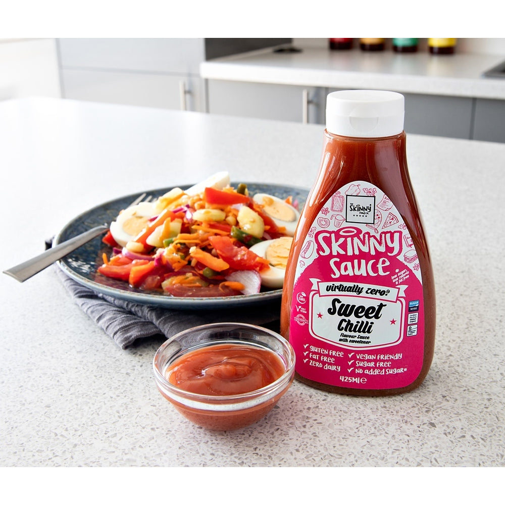Sweet Chili: Water, Tomato Paste, Thickeners (Citrus Fibre, Xanthan Gum), Salt, Acid (Acetic Acid, Citric Acid), Flavouring, Sweetener (Sucralose), Concentrate (Carrot & Blackcurrant), Chilli Powder, Preservatives (Potassium Sorbate, Sodium Benzoate), Colour (Caramel).