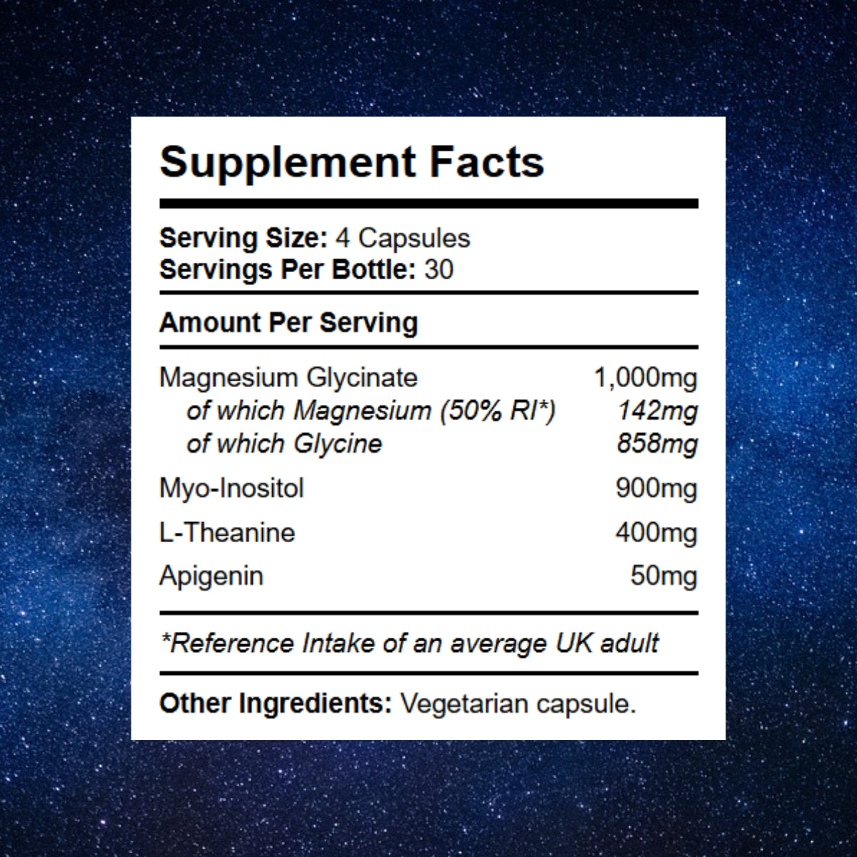 This sleep aid supplement is formulated using precise dosages of four premium-quality ingredients - Magnesium Glycinate, Myo-Inositol, L-Theanine and Apigenin - each of which has been recommended by many of the world's leading sleep experts and neuroscientists.