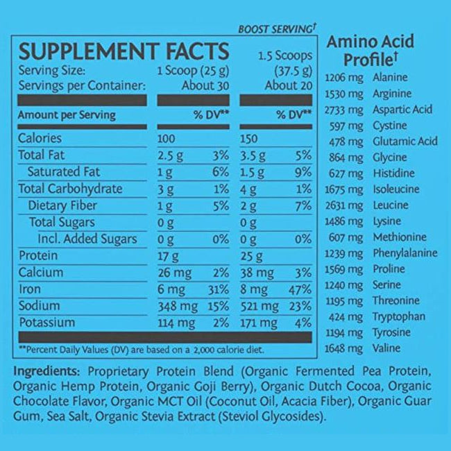 Warrior Blend Plant-Based Protein provides a full amino acid profile with all organic fermented pea protein, goji berry protein, hemp seed protein and MCTs from coconut.