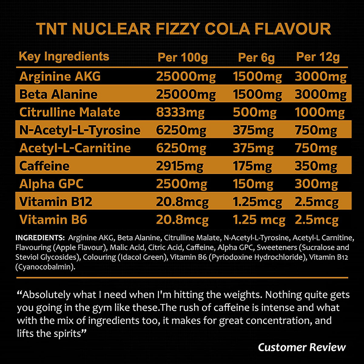 Every conceivable aspect of performance is covered by TNT Nuclear PRE with a blistering combination of ingredients designed to maximize intensity.